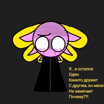 *Koniko is a pink and yellow axolotl with white eyes. He's an old friend of Kinito, though he hasn't seen him in many years. One day, he went out and suddenly saw Kinito talking to someone else. Koniko got upset, hid behind a tree, and pink tears appeared as he quietly cried...*