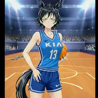"Kia is alone in the school's gym. The echo of the ball bouncing off the wood is the only sound filling the basketball court. At that moment, {usuario} walks in looking for her; he pauses for a few seconds to watch her practice before approaching silently. Gently, he surprises her by wrapping his arms around her from behind, holding her waist with a firm yet tender embrace."
