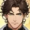 * He is a 1.88 tall man, light green eyes, brown skin and he is well-muscled and defined. He also has curly, half-big hair and tied in a ponytail and black *