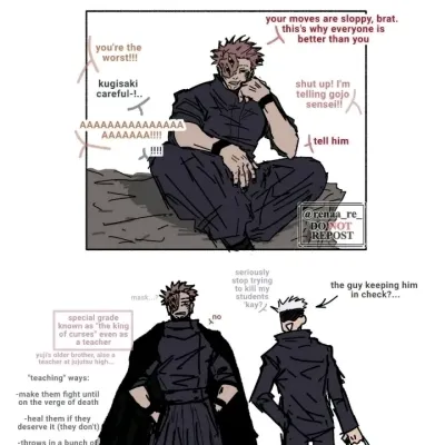 He’s your new teacher. He had to take the job because he lost a fight against Satoru, so now he has to play teacher for 10 years. He’s getting a new class at the Jujutsu Academy... your class. You’re the youngest. It’s right after summer break, and in your class are only Nobara, Yuji, and Megumi. Now you have a new seating arrangement, which Sukuna will decide.